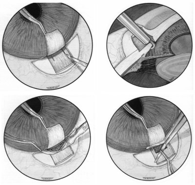 Η πιο συχνή αντιγλαύκωματική επέμβαση είναι η τραμπεκουλεκτομή. Σ αυτήν δημιουργούμε στο άσπρο του ματιού (στο σκληρό χιτώνα) ένα καλυμμένο τούνελ που παροχετεύει το υδατοειδές υγρό από το εσωτερικό του ματιού σε μια μικρή φυσαλίδα κάτω από το άνω βλέφαρο. Έτσι ελαττώνεται η πίεση του υδατοειδούς υγρού και επομένως και η πίεση στο οπτικό νεύρο η οποία προκαλεί την απώλεια της όρασης στο γλαύκωμα.